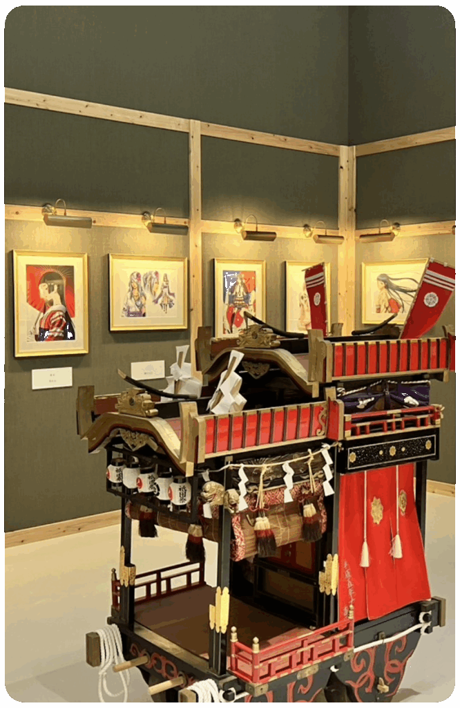 展示室の中央に祇園車を配置します。祇園祭は日本の伝統文化の象徴であり、全国各地において独自の形で行われています。そもそもは疫病を鎮める目的で平安時代の京都に始まり、各地域の文化や伝統に影響を与えてきました。疫病や災害から民を守るためのこの神事は、同じ願いを抱く領主の「侍」と「姫」に厚く庇護された歴史を持っています。